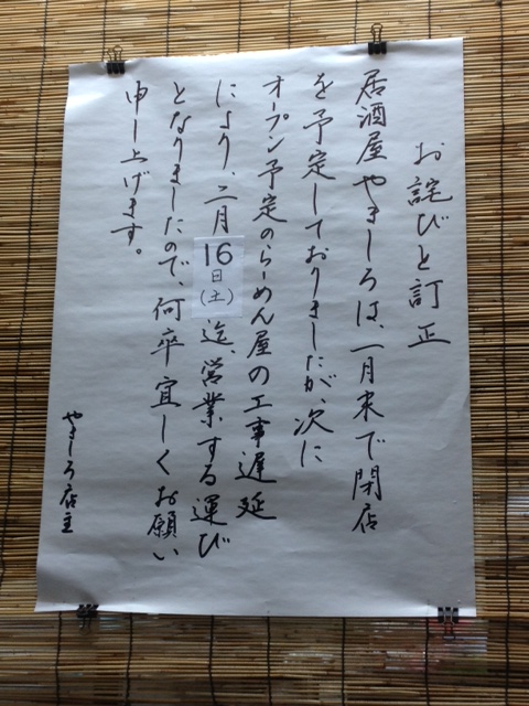 延期になっていた居酒屋やましろの閉店日が、いよいよ16(土)に決まりました。